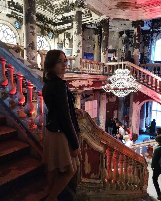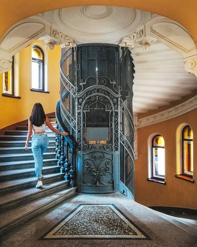 The residential house we are talking about was built in the 19th century. Its spiral stairs go up and around the well-elaborated wrought-iron lift tower. Soft light comes through the big yellow windows making the staircase look mysterious and of course, extremely photogenic.
