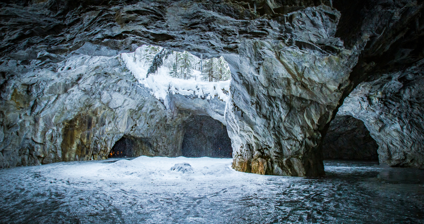 Another famous landmark of Ruskeala is an underground lake; this route was unknown until 2017, and today it is one of the most visited tourist sites in Karelia. The visit lasts for approximately an hour; you will visit Ruskeala caves with multicolored lights, a column hall, and the underground lake as a cherry on pie at the end of the route.
