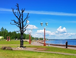 Kizhi is located in the heart of an unreal landscape where the sky, reflected in the limpid waters of Lake Onega, seems to hold suspended in the pristine air hundreds of small islands. In summer they seem to sparkle in the sun. Long used as a landmark by sailors navigating through the White Sea, it appears to visitors arriving nowadays via hydrofoil from Petrozavodsk, the capital of the Karelian Republic 68 km to the south, as a glistening three-faceted jewel.