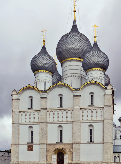 Rostov's cathedral is in many ways reminiscent of the Assumption Cathedral of the Moscow Kremlin. The 60-meter-high monumental edifice with a cross stands on the site of the old cathedral which had been built in the times of Andrei Bogoliubsky and collapsed during the fire in 1204. The fragments of the murals of the old cathedral and a handle of the wooden doors in the shape of a lion's head have been unearthed by archaeologists. Six massive pillars inside the cathedral hold the vault. The carved wooden iconostasis of the 18th century is of high artistic merit. The square in front of the cathedral used to be the town's center where veche (popular assembly in ancient Russia) was held, making decisions of war and peace.