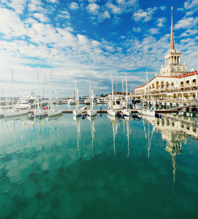 Sochi Seaport, the largest passenger port of the Black sea that accepts about 40 cruise ships annually. Besides being an important Russian hub, it is famous for its special look, reminding the ports in Southern Europe. The Marine Station is one of Sochi's landmarks: the building is a mixture of Soviet architecture and modern tendencies. The Port of Sochi is a favorite spot for surfers and yacht owners, and it has a particular vibe comparable to the best world resorts.