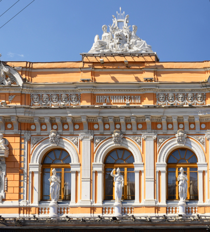 The circus, located on the embankment of the Fontanka River, was opened on December 26 in 1877. It was designed by the architect Vasily Kennel and became the first stone circus in Russia. The magnificent building is decorated with sculptural compositions and was considered to be one of the best circus constructions in Europe. In the arena of this circus the numerous performances of clowns, trained animals, and their famous trainers, gymnasts and jugglers took place.