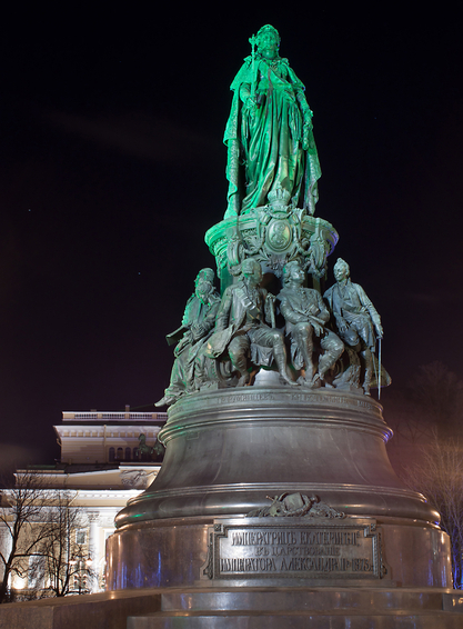 The Monument to Catherine II, located on Ostrovsky Square in St. Petersburg, was established in honor of Empress Catherine II in 1873. The idea to build a monument to Catherine II came to her retainers and nobles of the city in the early years of the reign of the Empress. But Catherine II was against it. The monument was created a century later, under a decree of Alexander II. This is evidenced by the inscription at the base of the monument: «To Empress Catherine II during the reign of Emperor Alexander II. 1873.» The Monument to Catherine II is a sophisticated sculptural composition. The Monument to the Empress is placed on a high pedestal, made of granite of Serdobol. At the base there are eight prominent people of her era — P. Rumyantsev, G. Potemkin, A. Suvorov, I. Betskoy, A. Bezborodko, E. Dashkova, A. Orlov and G. Derzhavin. All figures, including twice surpassing the others in size, the statue of Catherine, are made with astonishing portrait precision. The statue of Catherine II was directly made by sculptor M. Chizhov.