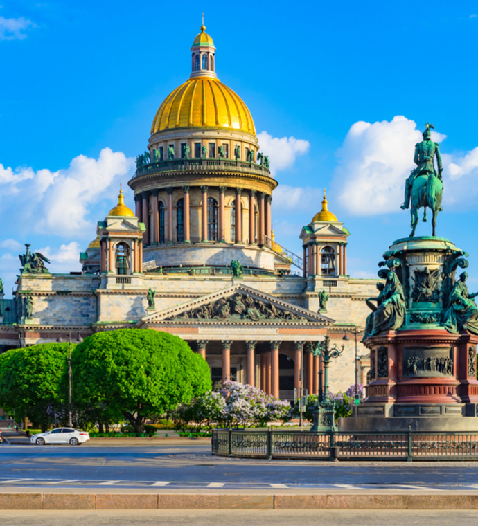 The pedestal of the monument by Auguste Montferrand has an elliptical shape and is made of red Finnish granite, dark crimson porphyry, and white Italian marble. The base is made of gray granite of Serdobol. The pedestal of the monument is decorated with four allegorical female figures personifying the «Strength», «Wisdom», «Justice» and «Faith.» The figures' heads are portraits of Empress Alexandra Feodorovna and daughters of Nicholas I — Maria, Alexandra, and Olga. Between the first two statues, there is a bronze gilded national emblem, under which there is the inscription: «To Nicholas I — Emperor of Russia. 1859.» The monument was considered a technical marvel for its time: it was the first equestrian statue in Europe, placed on two points of support (hind legs of the horse). In the 1860s, between the monument to Nicholas I and St. Isaac's Cathedral was laid out in a public garden. Nowadays the Isaac's Square is one of the most beautiful places in St. Petersburg.