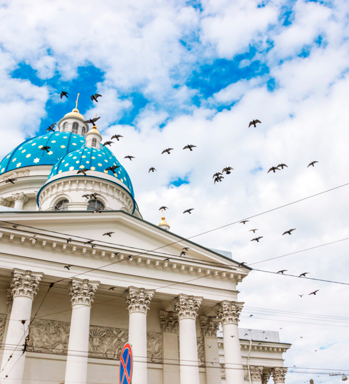 The Trinity Cathedral is a tall white church with five blue domes in the shape of a hemisphere, studded with bronze stars and golden crosses. According to a legend, the color of the domes was chosen by the Izmailovo Regiment's uniforms. The main dome of the cathedral can be seen at a distance of nearly 20 kilometers. Small domes are located above the columns of the porticoes. The facades are decorated with four six-column porticoes of the Corinthian Order. There are placed bronze figures of angels by sculptor S. Galberg in the niches of the western portal. Since the cathedral was the main garrison church of the city, its walls were decorated with Turkish flags — the trophies obtained during the battles in the Russian-Turkish war of 1877 — 1878. In memory of the fallen soldiers, their names were carved on the marble slabs. The interior of the church is decorated with Corinthian columns and pilasters, covered with white artificial marble. The walls and ceilings are painted by artists T. Medvedev and A. Travin. The icon of the Holy Trinity, written in the 15th century, is one of the most revered shrines of the Trinity Cathedral. In the church, there are new icons, including mosaic images of Saints Peter and Paul and Saint Nicholas. The Trinity Cathedral is included in the list of UNESCO World Heritage Sites as a part of the historical center of St. Petersburg.
