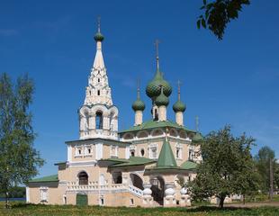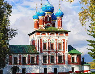Transfiguration Cathedral of Our Savior (1713) was erected on the site of the royal Church of Constantine and Elena which was a part of the prince's palace ensemble. The cathedral, topped with five solid domes, was built by Yaroslavl's master craftsmen. An armature frieze encircles the cupola drums, windows are embellished with decorative casings. The entrance into the cathedral is of rare beauty. It is ornate with a white-stone portal lavishly adorned with a pattern.