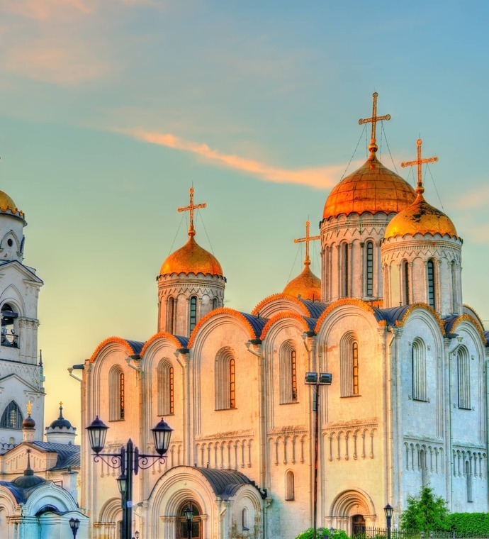 Its gilded domes and the facade, bearing a frieze of arches and columns, emphasize impressiveness and solemnity. The cathedral of Vladimir was the prototype of the Assumption Cathedral in the Moscow Kremlin.
