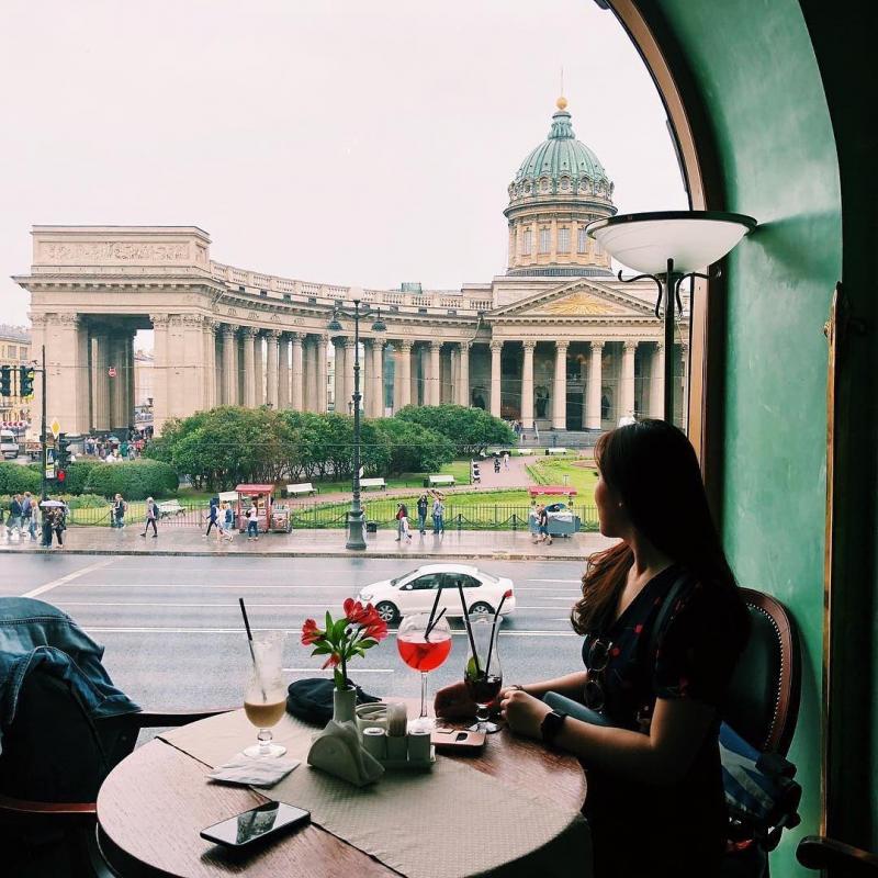 Probably, one of the best and easily accessible places for the classic coffee posts. The cafe is located in the scenic Singer House next to the famous bookstore Dom Knigi (which means ‘The House of the Book’). Go up to the second floor and enjoy the elegant interior, aromatic coffee, and the view to the Kazan Cathedral through the panoramic windows.