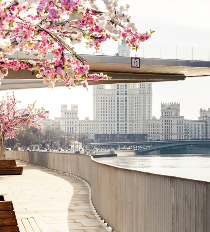You can take beautiful pictures and selfies in "Zaryadye" on one of the best viewing platforms in the city – the River Overlook, which opens a picturesque view to the Kremlin, the Cathedral of Christ the Saviour, the towers of Moscow city, high-rise on Kotelnicheskaya embankment, the Moscow river and the Park itself.