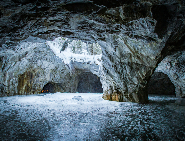 Another famous landmark of Ruskeala is an underground lake; this route was unknown until 2017, and today it is one of the most visited tourist sites in Karelia. The visit lasts for approximately an hour; you will visit Ruskeala caves with multicolored lights, a column hall, and the underground lake as a cherry on pie at the end of the route.